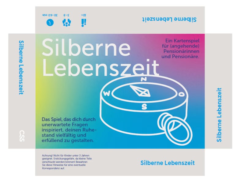 Wem von uns ist es zuzutrauen, nach der Pensionierung eine eigene Firma zu gründen, Kindern bei den Hausaufgaben zu helfen oder in der Sahara vom Kamel zu fallen? Ob am Familientisch, im Vereinslokal oder am Quartierfest: Silberne Lebenszeit ist ein inspirierendes und unterhaltsames Spiel mit 175 witzigen und überraschenden Fragen, über Ideen und Möglichkeiten nach der Pensionierung. In einer Spielrunde von 2-8 Spielenden werden die Fragen, kategorisiert in abenteuerliche, unternehmerische, engagierte, entspannende und aktive Inspiration laut vorgelesen. Danach führen alle Spielenden mit einem geheimgehaltenen JA/NEIN-Plättchen eine Selbsteinschätzung durch und zeigen mit ihrem Zeigerplättchen auf die Person, auf welche sie denken, dass die Frage am besten zutrifft (Fremdeinschätzung). Bei einer richtigen Einschätzung (Pfeil zeigt auf JA), wird ein Empathiepunkt für die Gruppe gesammelt. Nach Vergabe der Empathiepunkte wird in der Gruppe diskutiert, wie die Spielenden zu ihrer jeweiligen Einschätzung gekommen sind, dabei dürfen Pfeile auf Input der Mitspielenden auch neu ausgerichtet werden. Sind alle mit ihrer Platzierung zufrieden, vermerkt jeder Spieler so viele Striche bei dem Aktivitätsprofil der aktiven Spielfrage, wie viele Pfeile auf ihn gezeigt haben. Am Ende des Spieles erfolgt für jeden Spielenden eine Auswertung, zu seinem individuellen Aktivitätsprofil mit Tipps, Empfehlungen und weitere Inspiration. Neben den 125 Inspirationsfragen gibt es zudem 50 Reflexionsfragen. Bei Reflexionsfragen erfolgt ausschliesslich eine Selbsteinschätzung. Sie enthalten reflektierende Fragen rund um Gesundheit, Schlaf, Ernährung, Fitness, Freunde, Lebenseinstellung und Achtsamkeit (Merkmale aus den Blauen Zonen, also Regionen der Welt, in denen Menschen überdurchschnittlich gesund Altern und eine hohe Lebenserwartung haben). Ziel der Reflexionskarten besteht darin, zur Selbstreflexion anzuregen und Einzuladen, Gedanken, Freude, Ängste und Ansichten auszutauschen.